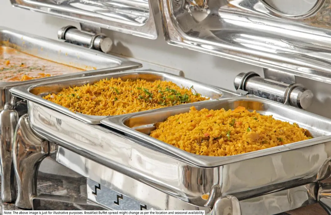 The hotel's in-house restaurant serves pure vegetarian food featuring North Indian and South Indian varieties for lunch and dinner. A complimentary continental breakfast is provided daily.